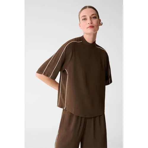 Voor een verzorgde everyday look is deze bruine dames top met opstaande kraag van Shoeby een fijne basis. De top heeft een rustige effen kleur in bruin/wit, aangevuld met subtiele contrast biezen. De rechte mouwen en de opstaande kraag geven een nette, moderne uitstraling die past bij zowel werk als vrije tijd. Door de low-stretch stof blijft het model mooi in vorm en sluit het licht aan zonder strak te voelen.Kenmerken van deze Shoeby top Effen bruine/witte kleur met contrast bies voor een rustige, maar verzorgde look Opstaande kraag die direct wat extra stijl toevoegt aan je outfit Low-stretch materiaal dat stevig aanvoelt en het silhouet mooi houdt Lange, rechte mouwen voor net wat extra bedekking en comfort Piping detail langs de naden voor een subtiel accent Geen zakken, waardoor de top glad en netjes langs je lichaam valt Onderdeel van een co-ord set, ideaal als je houdt van een afgestemde outfit Wasbaar op 30 graden, handig voor dagelijks gebruik Model is 176 cm lang en draagt maat S, als referentie voor de pasvormDaily stijl voor elke dagDeze top komt uit de Daily collectie en is gemaakt voor alledaagse momenten. Combineer met een bijpassende broek uit dezelfde set of draag de top op een jeans of nette pantalon voor een eenvoudige, maar doordachte look, zeker in het voorjaar.Shoeby, altijd eigentijdse modeShoeby richt zich op moderne mode die goed aansluit bij het dagelijks leven. De collecties worden ontworpen met aandacht voor pasvorm, draaggemak en een herkenbare, eigentijdse stijl. Zo stel je zonder moeite outfits samen die zowel praktisch als modieus zijn.Een veelzijdige top die je garderobe op een rustige en stijlvolle manier aanvult.