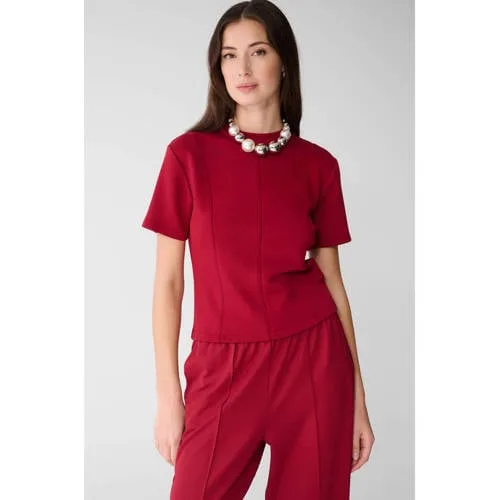 Breng kleur in je dagelijkse garderobe met deze Shoeby top in donkerrood. De aangesloten pasvorm en cropped lengte geven een moderne uitstraling, terwijl de zachte, soepele stof met high-stretch prettig meebeweegt met elke stap die je zet. Fijn op dagen waarop je iets wilt dragen dat zowel comfortabel als verzorgd oogt.Details die elke dag kloppenHigh-stretch kwaliteit die mooi aansluit en veel bewegingsvrijheid biedtGemaakt van lyocell, acetate en elastaan voor een zachte, gladde touchCropped model dat mooi valt op een hoge taille broek of rokDonkerrode effen kleur die makkelijk combineert met basic en denimRonde hals en rechte mouwen met korte mouwlengte voor een rustige lookDoorgestikte afwerking voor een nette, verzorgde uitstralingZonder sluiting, zodat je de top eenvoudig aantrektGeschikt voor lente en herfst binnen de dagelijkse collectieWasbaar op 30 graden, prettig in onderhoudHet model is 176 cm lang en draagt maat SGemakkelijk te stylen in je dagelijkse looksDe donkerrode cropped top leent zich goed voor alledaagse outfits. Combineer met een hoge taille jeans en sneakers voor een relaxte dag, of kies een rechte pantalon en laarsjes voor een meer geklede uitstraling. Door het effen design past de top ook goed onder een blazer of vest.Shoeby als vertrouwde stijlpartnerShoeby staat voor eigentijdse mode die goed in het dagelijks leven past. De collecties zijn ontworpen met oog voor draagbaarheid, wisselende seizoenen en een herkenbare stijl. Met deze top haal je een garderobestuk in huis dat past binnen die visie, zodat jij eenvoudig combinaties maakt waar je lang plezier van hebt.Een donkerrode basic met modern cropped silhouet waar je keer op keer naar grijpt.