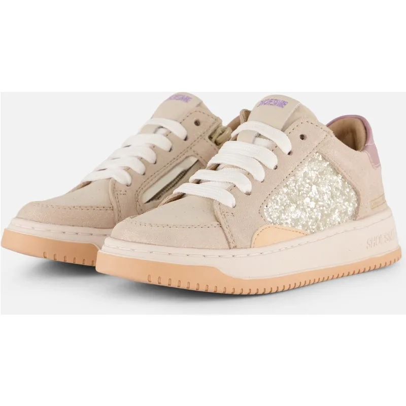 Deze Shoesme sneakers voor meisjes zijn zorgvuldig vervaardigd uit leer voor zowel de buitenkant als de voering. De opvallende beige kleur, verrijkt met glitters, zorgt voor een feestelijke uitstraling. Met een praktische vetersluiting en een stevige rubberen zool bieden deze schoenen optimale grip en comfort voor dagelijks gebruik en speelplezier.