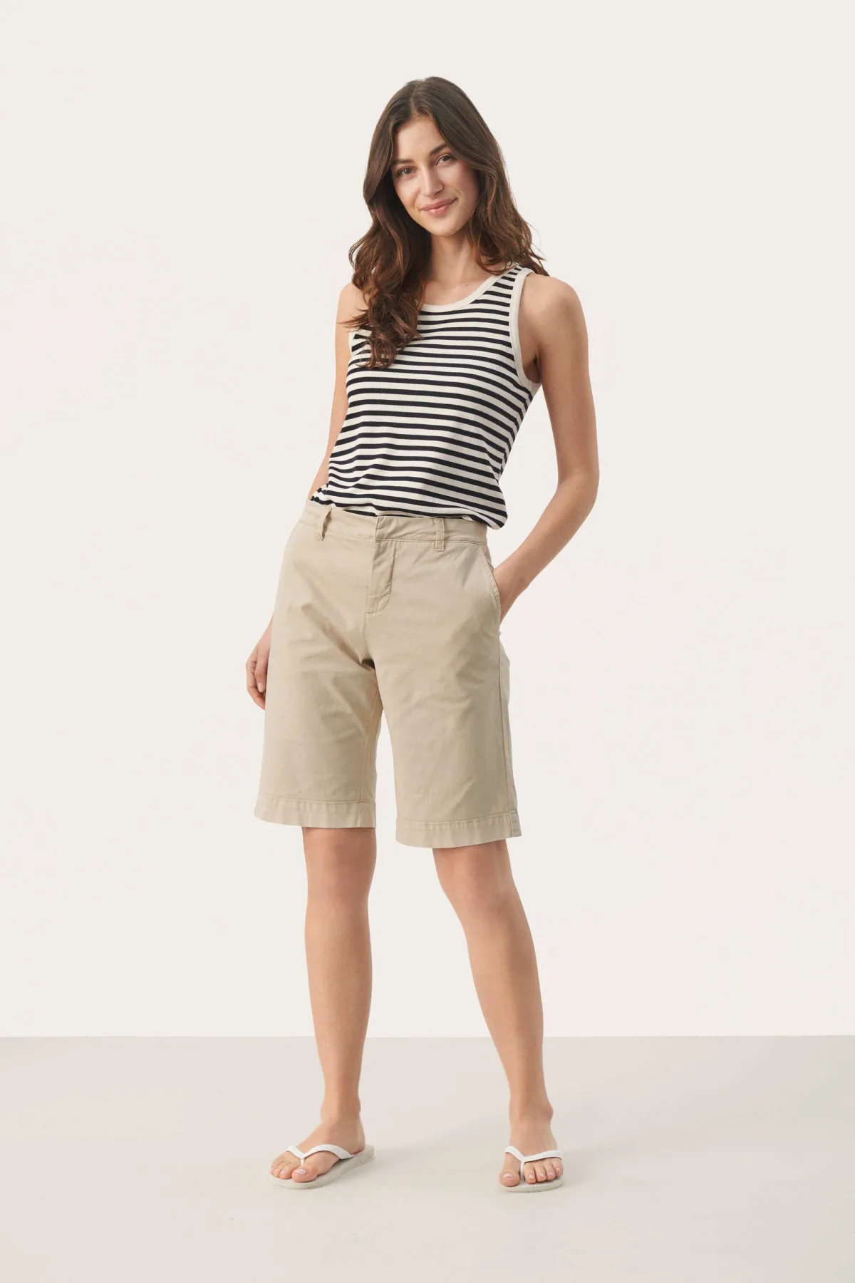 Stijlvolle short met rechte pasvorm, omgeslagen zoom, riemlussen en zijzakken. De gladde voorkant geeft een strakke, tijdloze look.