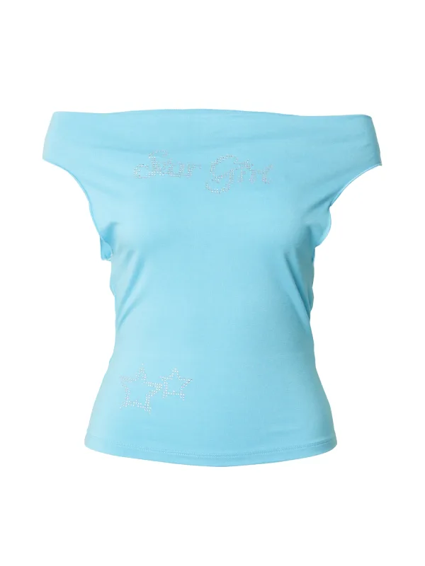 Design: Gevoerde zoom/rand, Rechte zoom, Strapless/off-shoulder; Materiaal: Jersey; Halstype: Carmen hals; Motief: Tekst print; Details: Sierstenen; Extra's: Glanzend, Op staal naden, Voelt zacht aan; Pasvorm: Slanke pasvorm; Armlengte: Kwartmouw; Lengte: Normale lengte