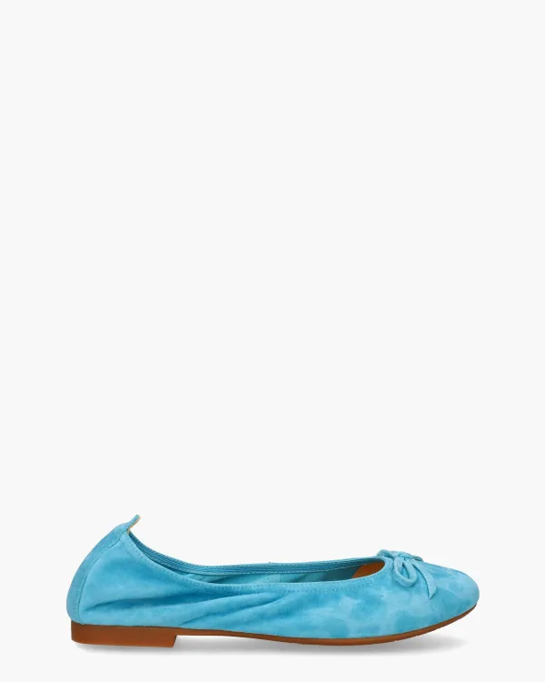 Elegante ballerina's voor dames, Haniya II, uit de collectie van Si. Deze tijdloze loafers, met een ronde leest, zijn vervaardigd van suède in een turquoise tint voor een opvallende uitstraling. De binnenzijde is bekleed met leer en voorzien van een vast voetbed voor optimaal comfort. De elastische bewerking zorgt voor een nauwsluitende