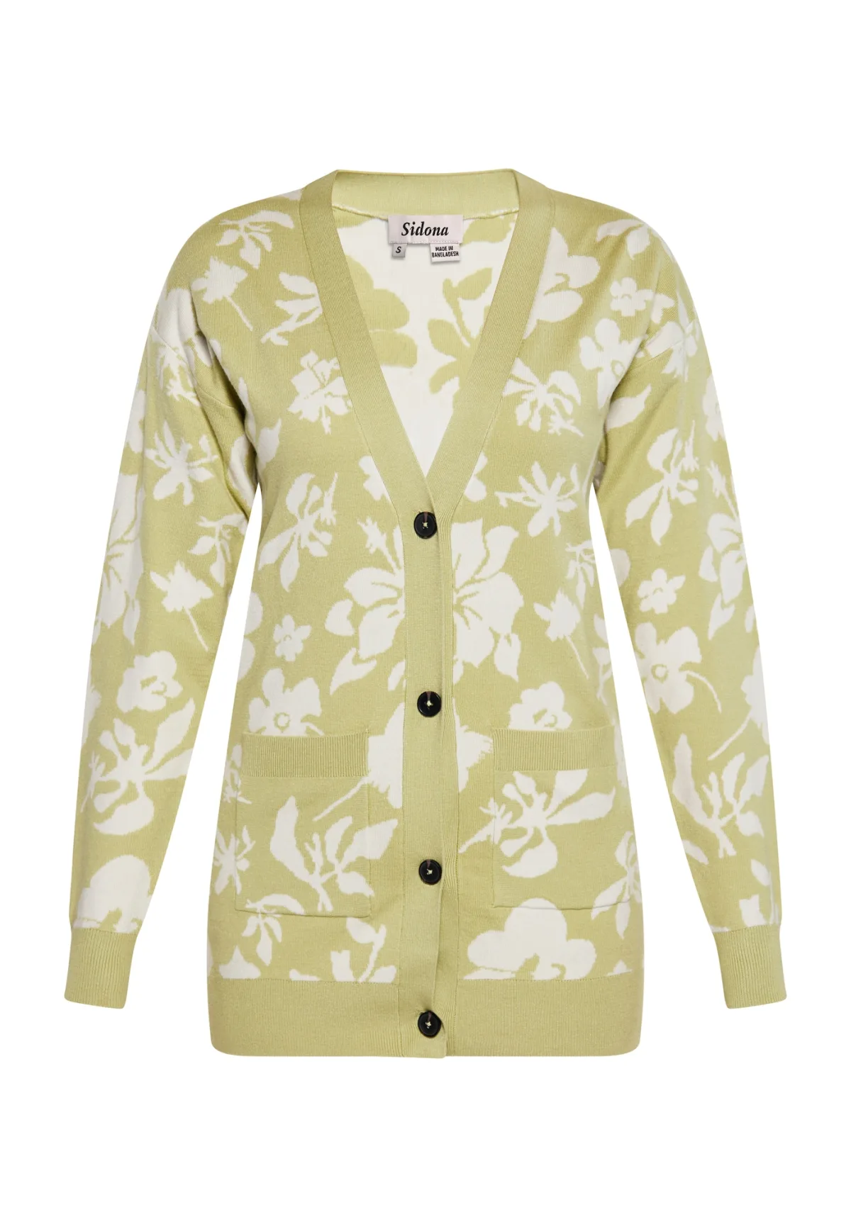 Design: Opgezette zakken; Type sluiting: Knoopsluiting; Materiaal: Knitwear; Halstype: V-hals; Motief: Bloemenprint; Extra's: Fully fashioned; Pasvorm: Normale pasvorm; Armlengte: Lange mouw; Lengte: Normale lengte