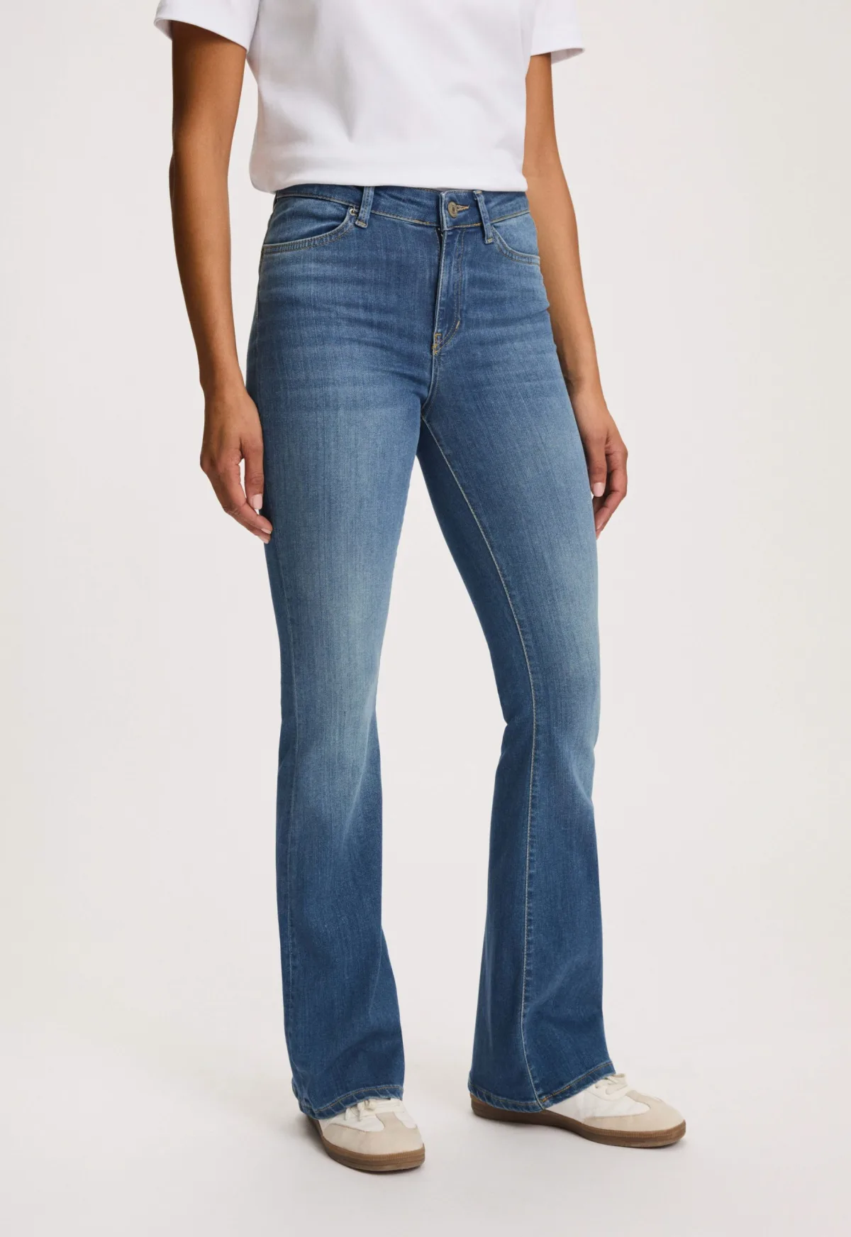 De Celsi Flare Jeans is van het merk Silvercreek. De Celsi Flare in Medium Stone mixt het skinny top-block van Celsi met een uitgesproken flared leg— een silhouet dat onmiskenbaar verwijst naar de seventies. De fit zit hoog in de taille en sluit strak aan tot net onder de knie. Daar loopt de pijp geleidelijk uit voor een vrouwelijk, langmakend effect. De jeans is een 4-pocket model met ritssluiting. De denim voelt stevig aan, maar dankzij desubtiele 2% stretch beweegt hij prettig met je mee. De wassing is een heldere 70's blue, met een licht contrast en een uitgesproken waspatroon voor extra diepte. Gele stiksels versterken de retro vibe, zonder dat het kost gaat van de moderne uitstraling.