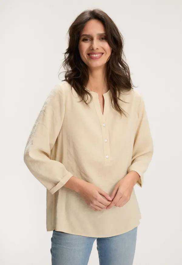 Dit is de Kara Blouse van het merk Silvercreek. Deze blouse heeft een driekwart mouw met omgeslagen boord, een v-hals met een knoopsluiting, een plooi detail op de rug en de achterkant onder is rond afgewerkt. De blouse heeft aan de onderkant en op de rug een label met het Silvercreek label erop.