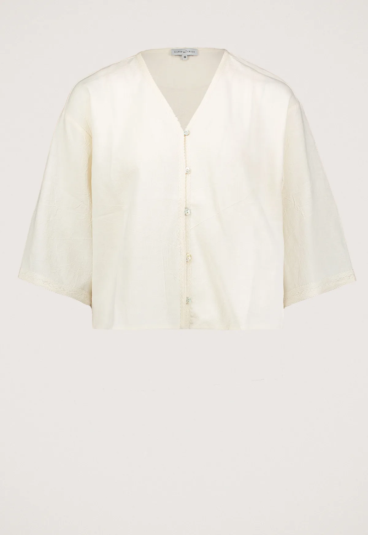 Dit is de Kaya Blouse van het merk Silvercreek. Deze blouse heeft een losvallende pasvorm, wijde driekwart mouwen en een lace rand om de binding en mouwen, wat zorgt voor een elegante uitstraling. De blouse is gemaakt van een combinatie van ramie en polyester, wat bijdraagt aan een lichtgewicht en comfortabele draagervaring.