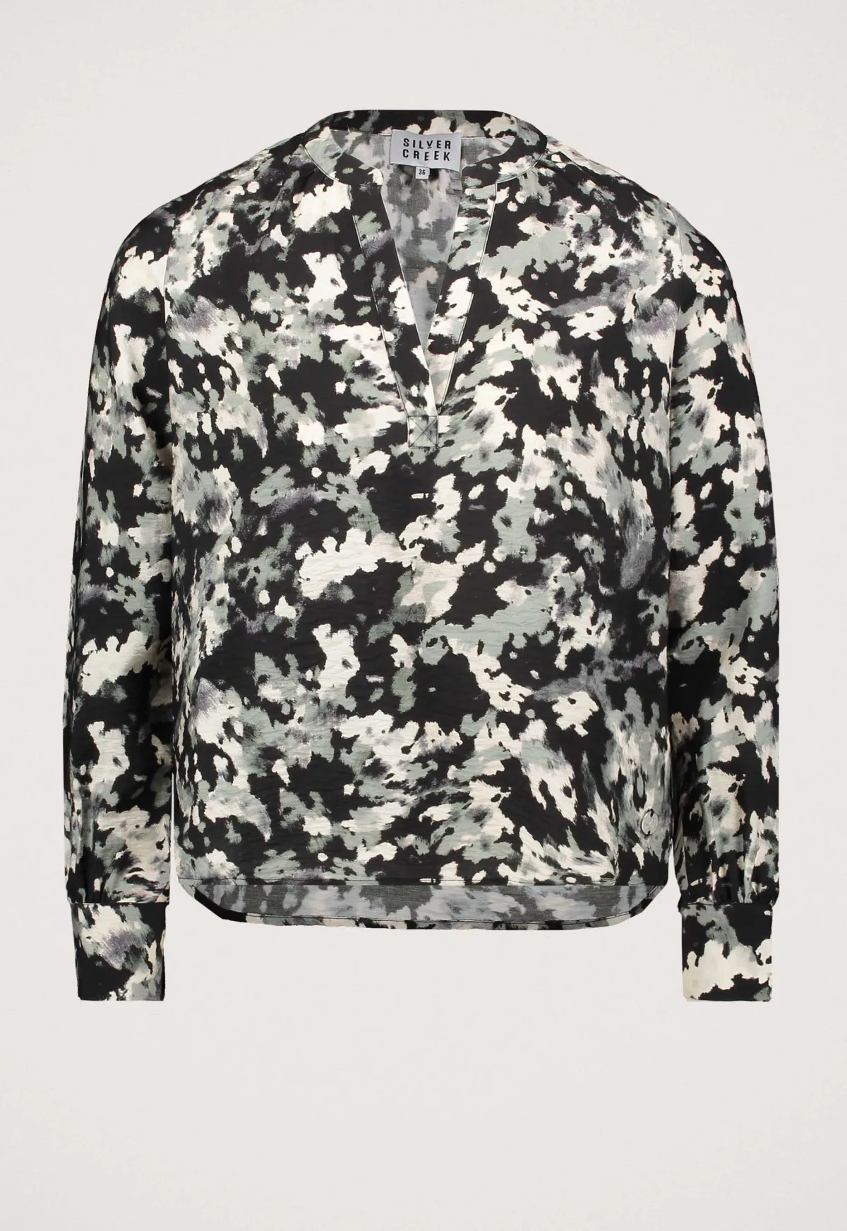 Dit is de Kira Print blouse van het merk Silvercreek. Deze blouse heeft een losvallende pasvorm en is voorzien van een stijlvolle V-halslijn en lange mouwen. De blouse is gemaakt van een combinatie van viscose en polyamide, waardoor deze soepel valt en aangenaam aanvoelt op de huid. De manchetten zijn afgewerkt met knopen, wat een elegante touch geeft aan het geheel.