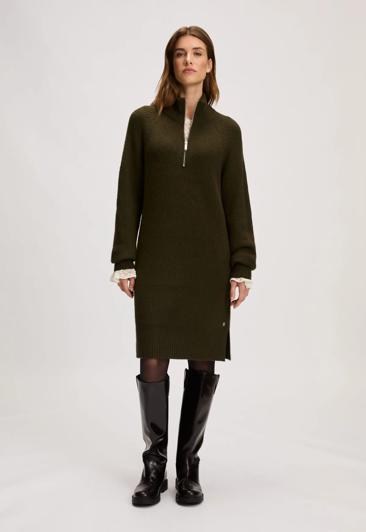 Dit is de Lilian Jurk van het merk Silvercreek. Deze jurk heeft een regular pasvorm en is gemaakt van een mooie mix van acryl, nylon, elastan en een vleugje wol, wat zorgt voor een comfortabele en aangename draagervaring. Het onderscheidende kenmerk van deze jurk is de hoge kraag met ritssluiting, die de jurk zowel stijlvol als praktisch maakt. De jurk is halflang en valt ongeveer tot de knie, ideaal voor verschillende gelegenheden.