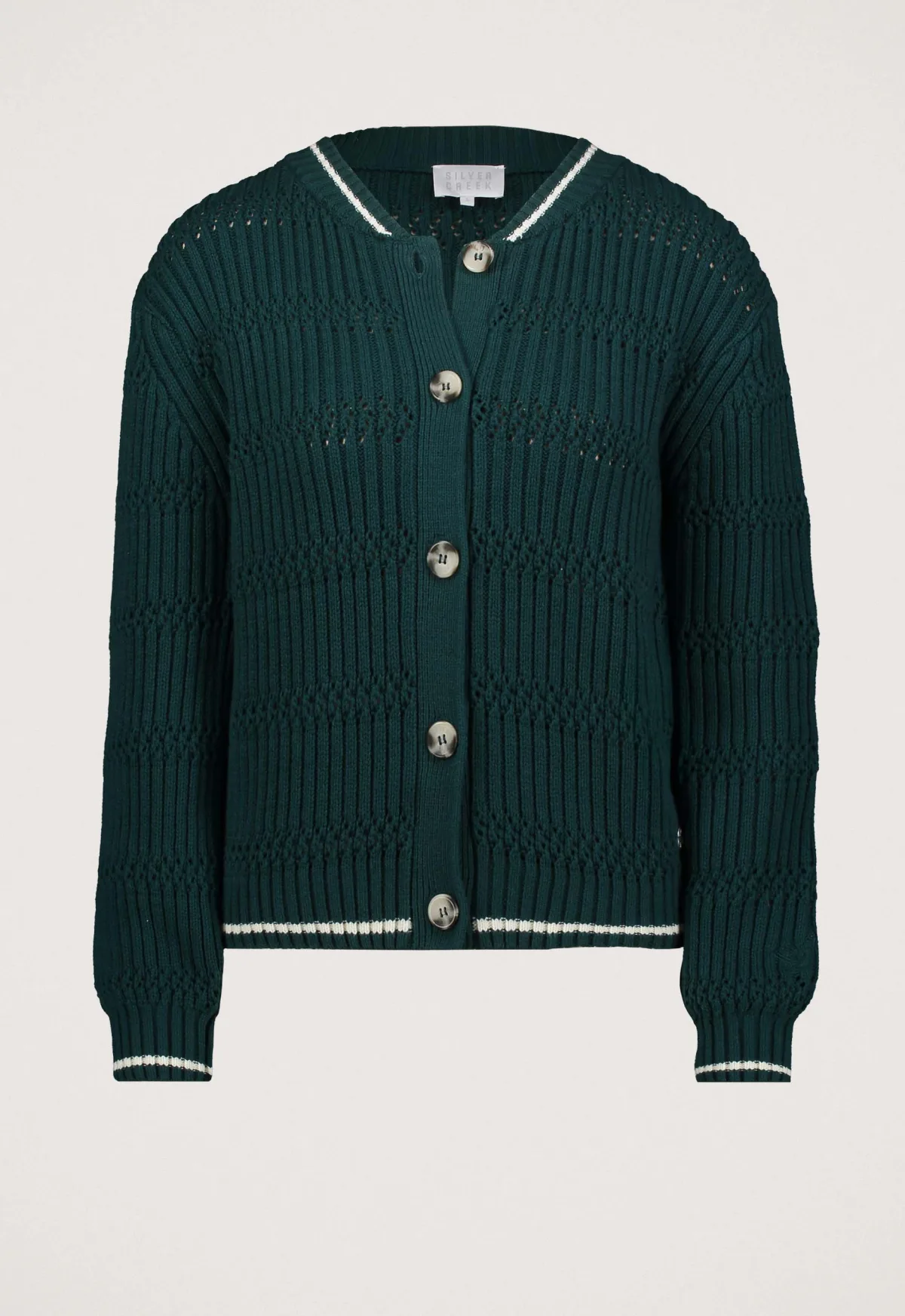 Dit is het Paige Vest van het merk Silvercreek. Dit vest heeft een regular pasvorm en is vervaardigd met een knoopsluiting. Het design is geïnspireerd door de klassieke baseball jacket, met unieke eigenschappen zoals de streepdetails op de boord. Het vest combineert een rib steek met ajour voor een moderne twist.