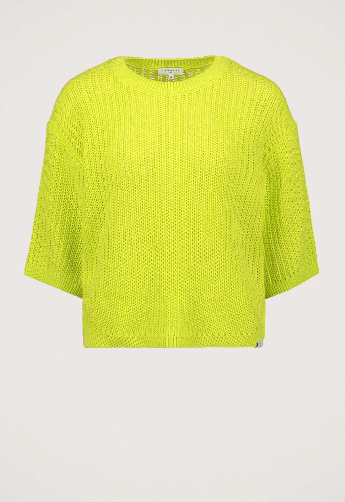 Dit is de Peppa Trui van het merk Silvercreek. Deze trui heeft een boxy fit en korte mouwen en is gebreid met een subtiel opengewerkte motief.