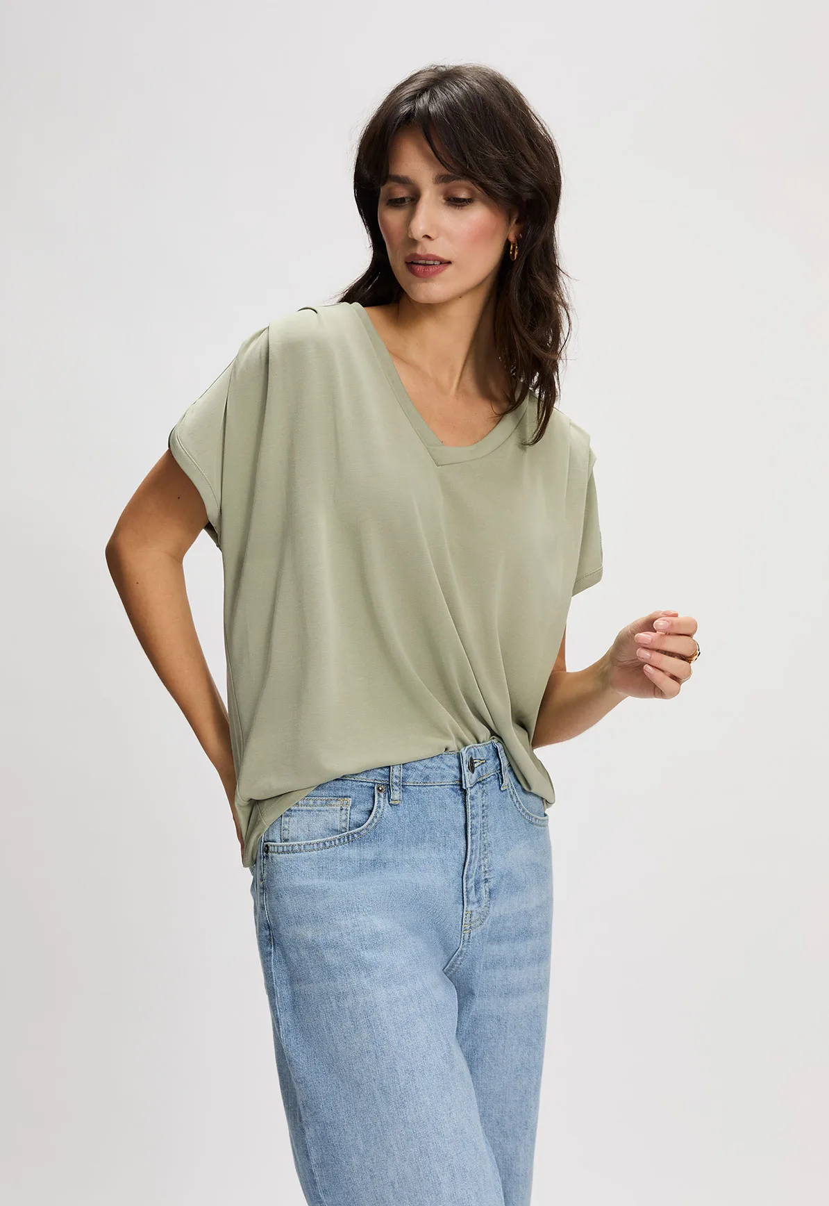 Dit is het Sanne T-shirt van het merk Silvercreek. Deze T-shirt heeft een boxy pasvorm en is gemaakt van een hoogwaardige mix van modal en polyester. Het sandwashed jersey geeft het shirt een zachte uitstraling en de V-hals zorgt voor een elegante touch. Met zijn korte mouwen is dit T-shirt zowel stijlvol als comfortabel.