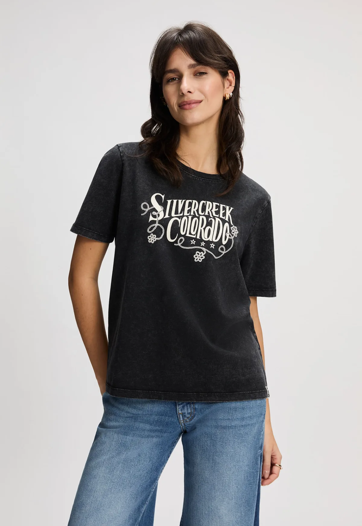 Dit is het Serena T-shirt van het merk Silvercreek. Deze T-shirt is gemaakt van 100% katoen, waardoor het comfortabel en ademend is. Het Serena T-shirt heeft een stijlvolle ronde halslijn en is voorzien van een unieke flock print die de afgewassen look compleet maakt. De korte mouwen voegen een casual touch toe aan het geheel.