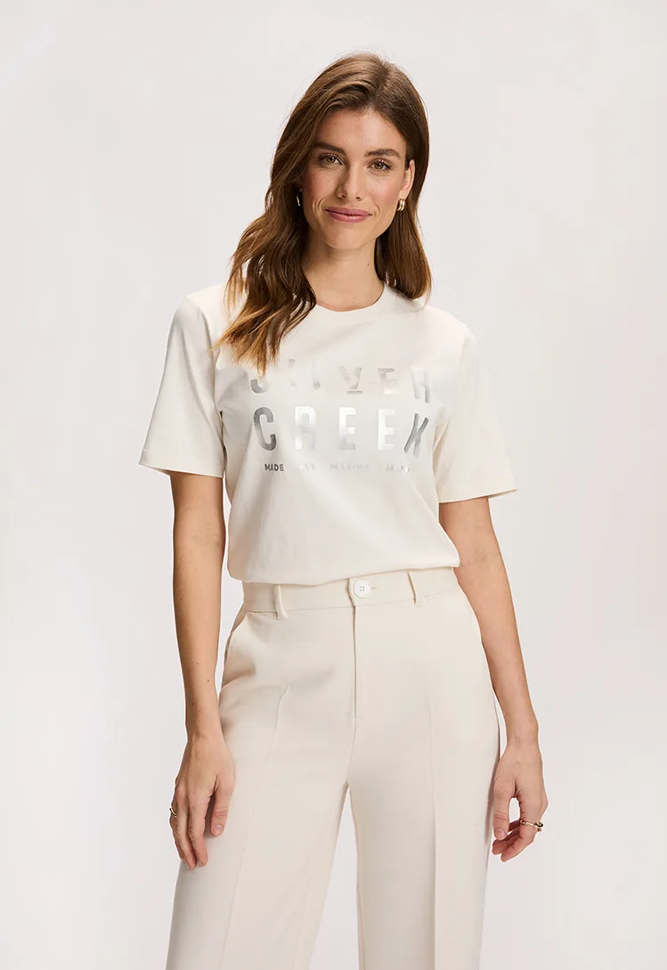 Dit is het Suvi T-shirt van het merk Silvercreek. Dit T-shirt heeft een regular pasvorm en is gemaakt van 100% katoen, wat zorgt voor comfort en ademend vermogen. Het T-shirt is voorzien van een opvallende zilveren metallic foil print met het Silvercreek logo.