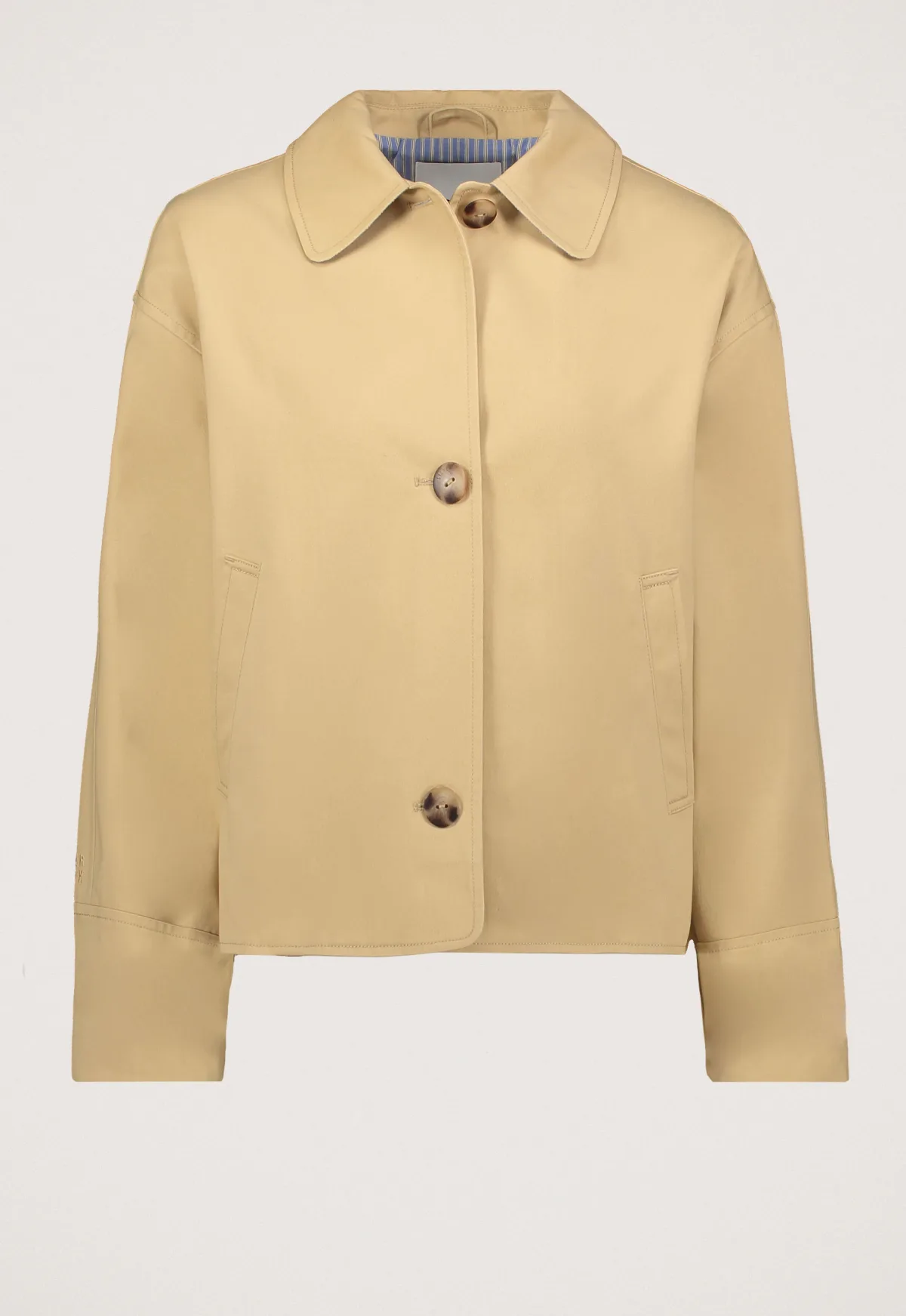 Dit is de Thalina Jas van het merk Silvercreek. Deze buitenjas heeft een comfortabele pasvorm en is volledig gemaakt van katoen, wat zorgt voor een aangenaam draaggevoel. De korte trench coat heeft een stijlvolle knoopsluiting en een opvallende grote plooi aan de achterkant. Praktische paspelzakken bieden voldoende opbergruimte, terwijl de gestreepte blauwe voering, die ook subtiel onder de kraag te zien is, een extra modieus detail toevoegt.