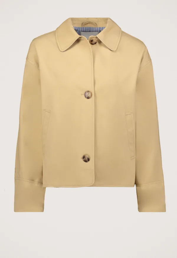Dit is de Thalina Jas van het merk Silvercreek. Deze buitenjas heeft een comfortabele pasvorm en is volledig gemaakt van katoen, wat zorgt voor een aangenaam draaggevoel. De korte trench coat heeft een stijlvolle knoopsluiting en een opvallende grote plooi aan de achterkant. Praktische paspelzakken bieden voldoende opbergruimte, terwijl de gestreepte blauwe voering, die ook subtiel onder de kraag te zien is, een extra modieus detail toevoegt.