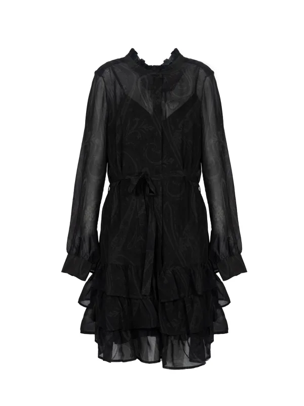 Eenvoudig model Midi-lengte, knielengte Kan worden vastgemaakt met knopen Met opstaande kraag Met lange mouwen Manchetten kunnen vastgemaakt worden met knopen Met ingezette onderjurk Gestrikt in de taille Onderste zoom versierd met ruches Gemaakt van hoogwaardige stof Gemaakt in Italië