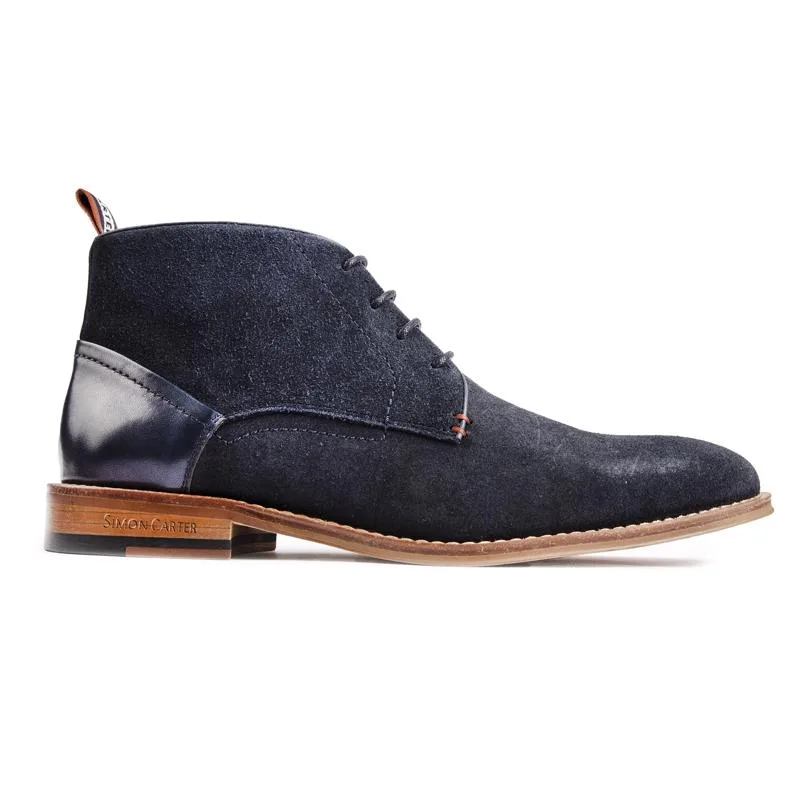 Blauwe Simon Carter Byrd 2 chukka-laarzen met veters, bovenwerk van glad suède leer, hiellip van textiel met designermerk, fijn leren hieldetail en exclusieve bedrukte voering en sok. Deze slimme, exclusieve herenschoenen van Simon Carter zijn je stijlvolle basisstuk voor vele gelegenheden.