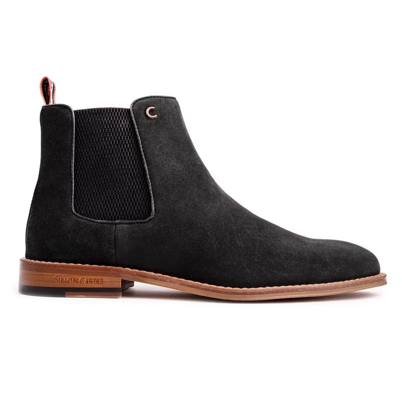Zwarte Simon Carter Elgar 2 veter Chelsea-laarzen voor heren met bovenwerk van glad suède leer. fijne details. Hiellipje van textiel met designermerk en exclusieve bedrukte voering en sok. Deze slimme. exclusieve herenschoenen van Simon Carter zijn je stijlvolle basic voor vele gelegenheden.