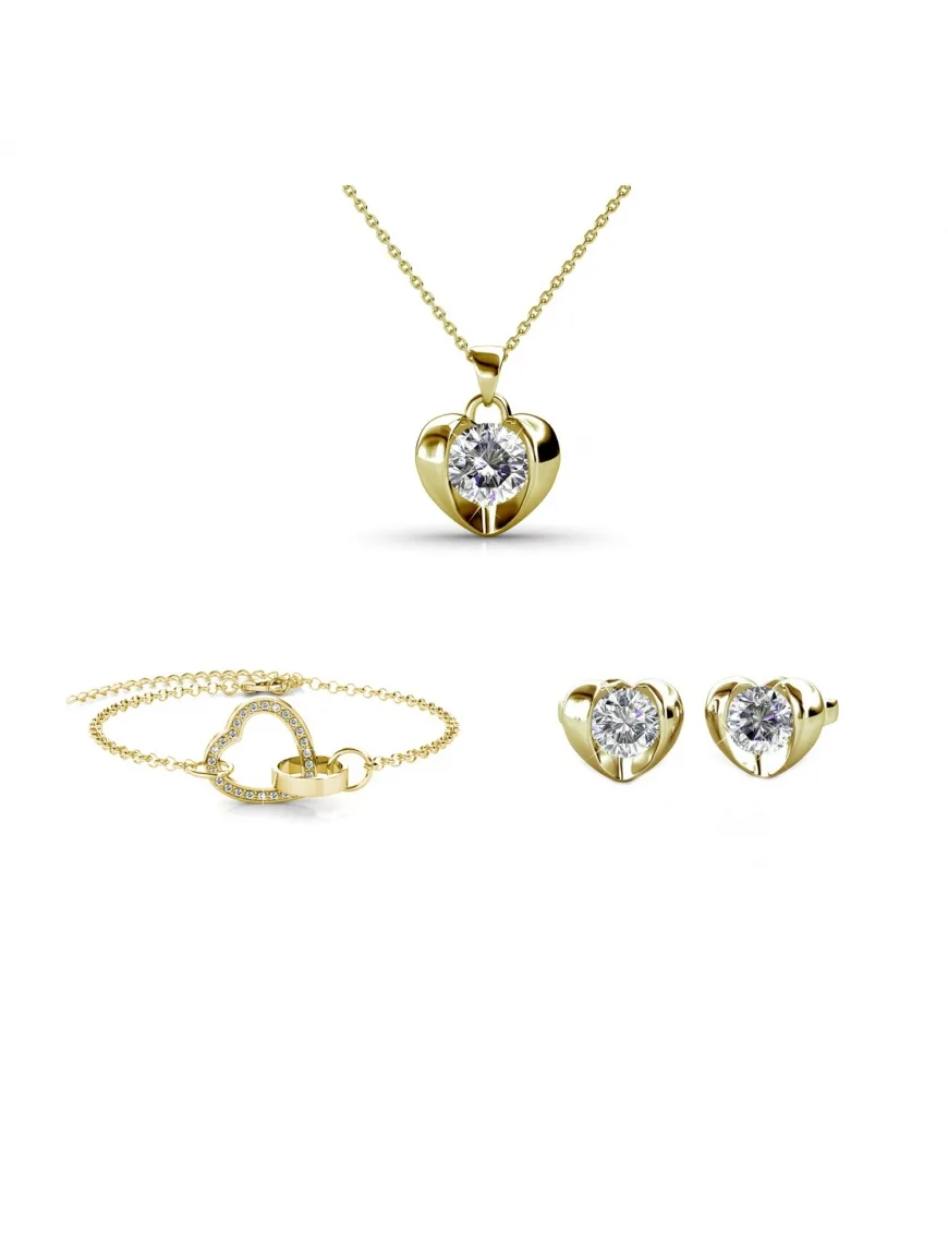 Samenstelling: Messing Afwerking: 18k verguld Steensoort: Oostenrijks kristal Aantal stenen (pces): 29 Kleur steen: Kristal Lengte ketting: 400 + 50 Grootte oorbellen (mm): 8 x 7 Lengte armband (mm): 160 + 50