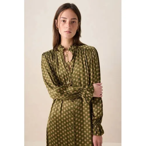 Donkergroene maxi jurk met print van Sissy-Boy. De jurk heeft lange pofmouwen, een hoge hals, knoopsluitingen een een afneembaar ceintuur in de taille. Verder heeft de jurk een all-over print met roze details. Het model heeft een lengte van 1,77 en draagt maat S. Materiaal: 100% viscose.