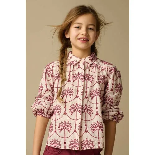 Lichtroze blouse met broderie van Sissy-Boy. De blouse heeft lange mouwen, een kraag en een knoopsluiting aan de voorzijde. Verder heeft de blouse een lichtroze kleur met een all-over palmbomen broderie design.
