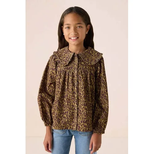 Donkergroene blouse met leopard print. De blouse heeft lange pofmouwen, een knoopsluiting, een oversized peter pan kraag met een ruffle en een regular fit. Verder is de blouse gemaakt van een corduroy rib kwaliteit.