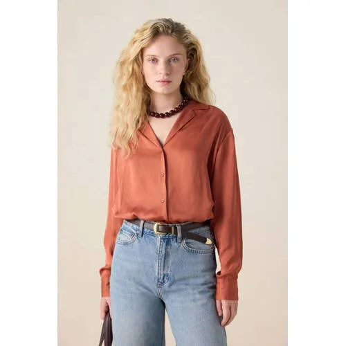 Rode blouse met reverskraag van Sissy-Boy. De blouse heeft lange pofmouwen, een V-hals, knoopsluitingen, een reverskraag en een regular fit. Verder zit de blouse aan de achterzijde geplooid en heeft het een satijnen look. Materiaal: 100% polyester.