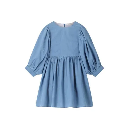 Lichtblauwe denim jurk van Sissy-Boy. De jurk heeft driekwart pofmouwen, een ronde halslijn, een ritssluiting aan de achterzijde en een wijd uitlopend model vanaf de taille. Verder heeft de jurk een denim kwaliteit met geplooide details bij de mouwen en taille.