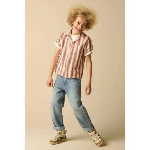 Donkerrode gehaakt overhemd van Sissy-Boy. Dit overhemd heeft een klassieke kraag, korte mouwen, een knoopsluiting en een opgestikte zak aan de voorzijde. Verder is het gemaakt van een gehaakte kwaliteit met donkerrode en witte patronen.