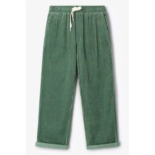 Groene corduroy pull on broek van Sissy-Boy. De broek heeft een elastische band met aantrekkoorden, twee steekzakken aan de voorzijde en twee opgestikte zakken aan de achterzijde. Verder is de broek gemaakt van een groene corduroy kwaliteit sen heeft het een omgeslagen detail rond de enkel.