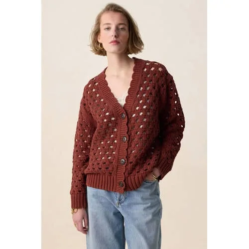 Donkerrood opengewerkt vest van Sissy-Boy. Het vest heeft lange mouwen, een V-hals, een knoopsluiting en een oversized fit. Verder heeft het vest een donkerrode kleur met gebreide opengewerkte details. Materiaal: 60% katoen, 40% acryl.