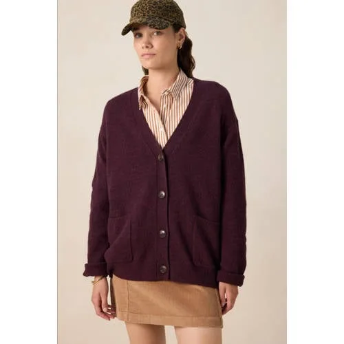 Donkerrood vest met V-hals van Sissy-Boy. Het vest heeft lange mouwen, een V-halslijn, een knoopsluiting en ribboorden bij de hals, mouwen en onderzijde. Daarnaast heeft het een bordeaux rode kleur met opgestikte zakken aan de voorzijde. Materiaal: 50% wol, 50% yak.