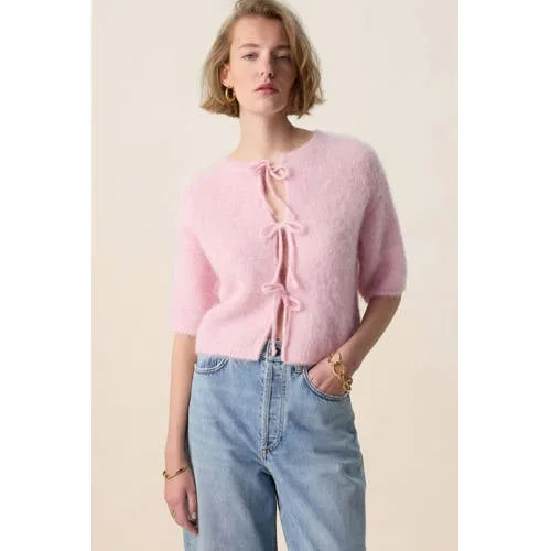 Lichtroze vest met strikjes van Sissy-Boy. Het vest heeft korte mouwen, een ronde halslijn en een regular fit. Verder wordt het vest gesloten met de strikjes knoopsluiting aan de voorzijde. Materiaal: 71% alpaca, 27% polyamide, 2% elastaan.