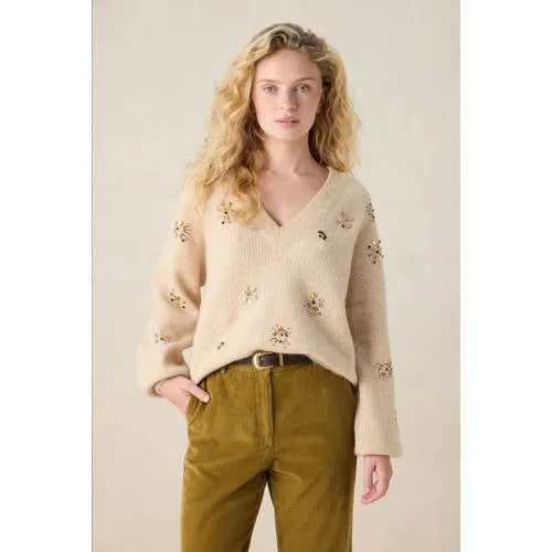 Beige trui met V-hals van Sissy-Boy. De gebreide trui heeft lange mouwen, een V-halslijn, ribboorden, verlaagde schouders en een relaxed fit. Daarnaast heeft het een beige kleur met glinsterende kralen details aan de voorzijde en mouwen. Materiaal: 49% nylon, 35% wol, 13% mohair, 3% elastaan.