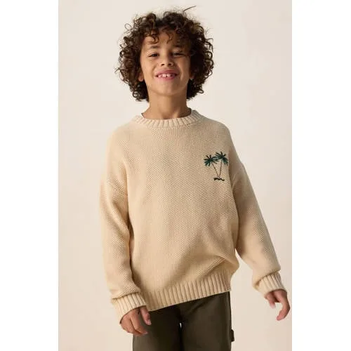 Beige gebreid crewneck van Sissy-Boy. De crewneck heeft lange mouwen, een ronde halslijn en relaxed fit. Verder heeft het een beige kleur met een palmboom embroidery op de voor-en achterzijde.