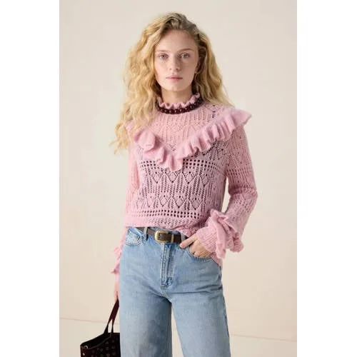 Roze ajour trui met ruffles van Sissy-Boy. De trui heeft lange mouwen, een hoge opstaande halslijn, ruffle details en een regular fit. Daarnaast heeft de trui een roze kleur met een all-over opengewerkt ajour patroon in de stof verwerkt. Materiaal: 41% nylon, 38% alpaca, 21% wol.