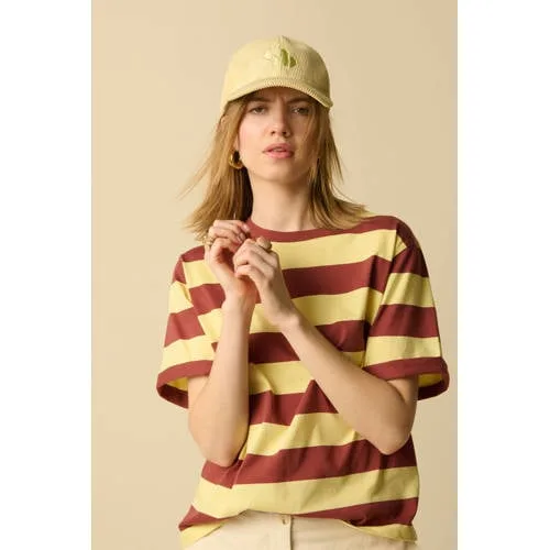 Donkerrood gestreept T-shirt van Sissy-Boy. Het T-shirt heeft korte mouwen, een ronde halslijn en een regular fit. Daarnaast heeft het een donkerrode kleur met een all-over brede strepen design met een gele kleur. Materiaal: 100% katoen.