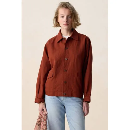 Donkerrood jack van Sissy-Boy. Het jack heeft lange mouwen, een kraag, een knoopsluiting en een relaxed fit. Verder heeft het jack een donkerrode kleur met twee klepzakken aan de voorzijde. Materiaal: 61% katoen, 39% linnen.