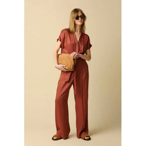 Donkerrode jumpsuit met ceintuur van Sissy-Boy. Deze satijnen jumpsuit met korte mouwen heeft een V-hals, een ceintuur in de taille, wijdvallende broekspijpen, geplooide details en een flap op de rug. Verder heeft de jumpsuit een glanzende satijnen look. Materiaal: 100% viscose.