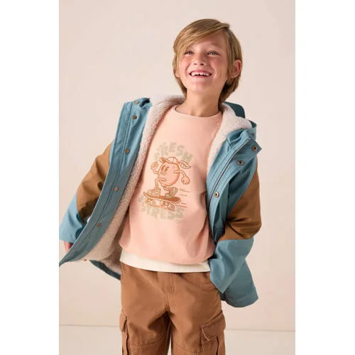 Blauwe lange regenjas met colourblock van Sissy-Boy. De regenjas heeft lange mouwen, een hoge halslijn, een capuchon, een ritssluiting en een knoopsluiting met windbreaker. De jas heeft aan de voorzijde flappockets, gevoerd met polar fleece. Daarnaast is de jas volledig gevoerd met 100% teddystof voor extra comfort.