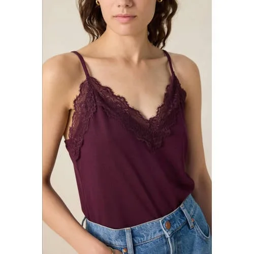 Donkerrood singlet met kant van Sissy-Boy. Het singlet heeft spaghettibandjes en een V-hals, afgewerkt met een kanten rand langs de bovenzijde. Het model heeft een lengte van 1,74 m en draagt maat S.