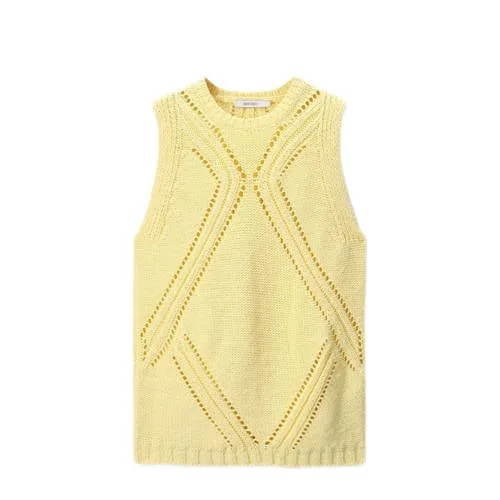Lichtgele gebreide top van Sissy-Boy. De top heeft een ronde halslijn, is mouwloos en een lichtgele kleur. Verder is de top gebreid en heeft het zowel aan de voor-en achterkant een opengewerkt patroon. Materiaal: 100% katoen.