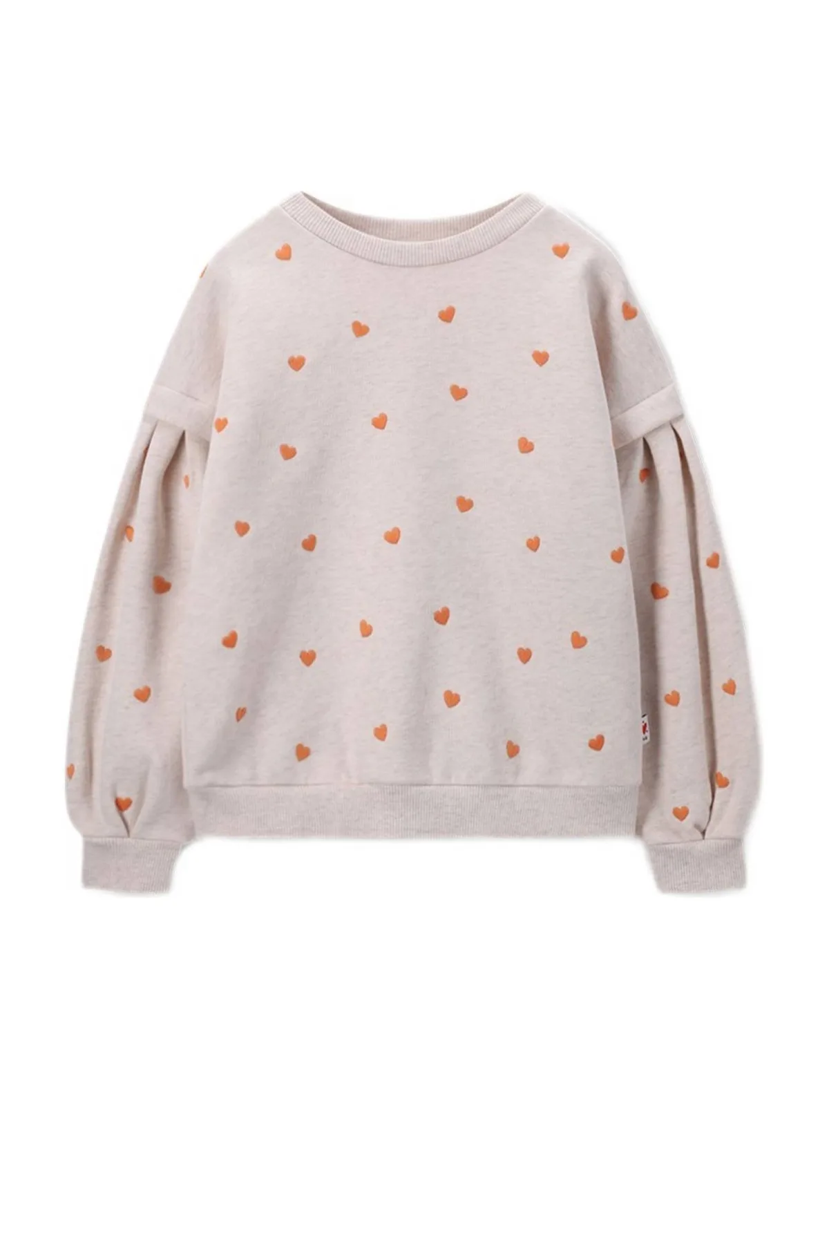 Beige sweater met hartjes van Sissy-Boy. De sweater heeft lange pofmouwen met verlaagde schouders, een ronde halslijn, ribboorden en all-over oranje hartjes embroidery.