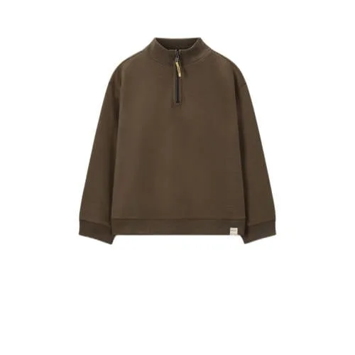 Donkergroene sweater met halve rits van Sissy-Boy. De sweater heeft lange mouwen, verlaagde schouders, een relaxed fit en een opstaande kraag met een korte ritssluiting. De hals heeft een rib kwaliteit met ribboorden bij de mouwen en onderzijde.
