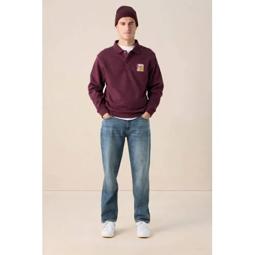 Paarse sweater van Sissy-Boy. De sweater heeft lange mouwen, een kraag met knoopsluiting, een rechte fit en artwork aan de achterkant. Materiaal: 100% katoen.
