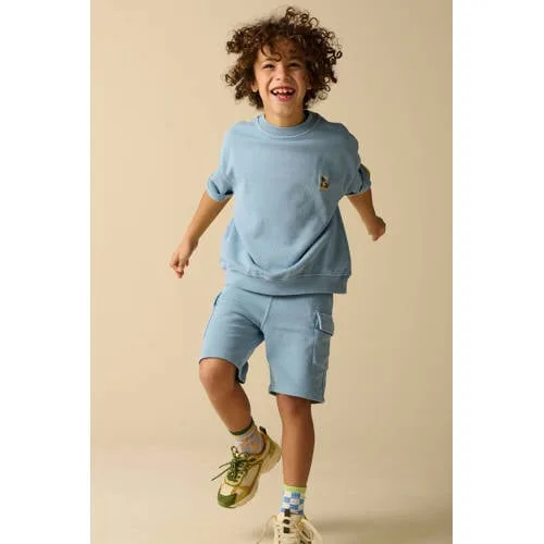Blauwe Parijn sweat short van Sissy-Boy. De korte broek heeft een middelhoge taille, een elastiekenband in de taille met een aantrekkoord, twee steekzakken en twee klepzakken aan de voorzijde. Materiaal: 100% katoen.