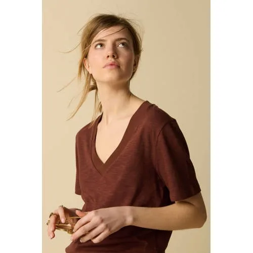 Donkerrood V-hals T-shirt van Sissy-Boy. Het T-shirt heeft korte mouwen, een V-halslijn en een regular fit. Verder heeft het T-shirt een slub kwaliteit met een bruin rode kleur. Materiaal: 53% modal, 47% katoen.