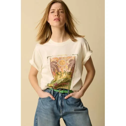 Wit T-shirt met palm print van Sissy-Boy. Het T-shirt heeft korte mouwen, een hoge ronde halslijn en een relaxed fit. Daarnaast heeft het een grafische palm print op de voorzijde. De print is vormgegeven met palmbomen, een zon, visjes en citroenen. Materiaal: 100% katoen.