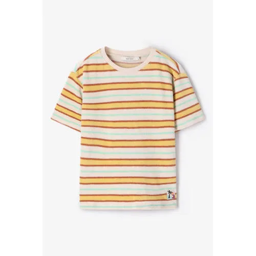 Geel T-shirt met strepen van Sissy-Boy. Het T-shirt heeft korte mouwen, een ronde halslijn en een regular fit. Verder heeft het T-shirt een gele kleur met multicolour horizontale strepen.