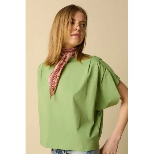 Groen T-shirt van Sissy-Boy. Het T-shirt heeft korte mouwen, een ronde halslijn, geplooide details op de schouders en een boxy fit. Materiaal: 100% katoen.